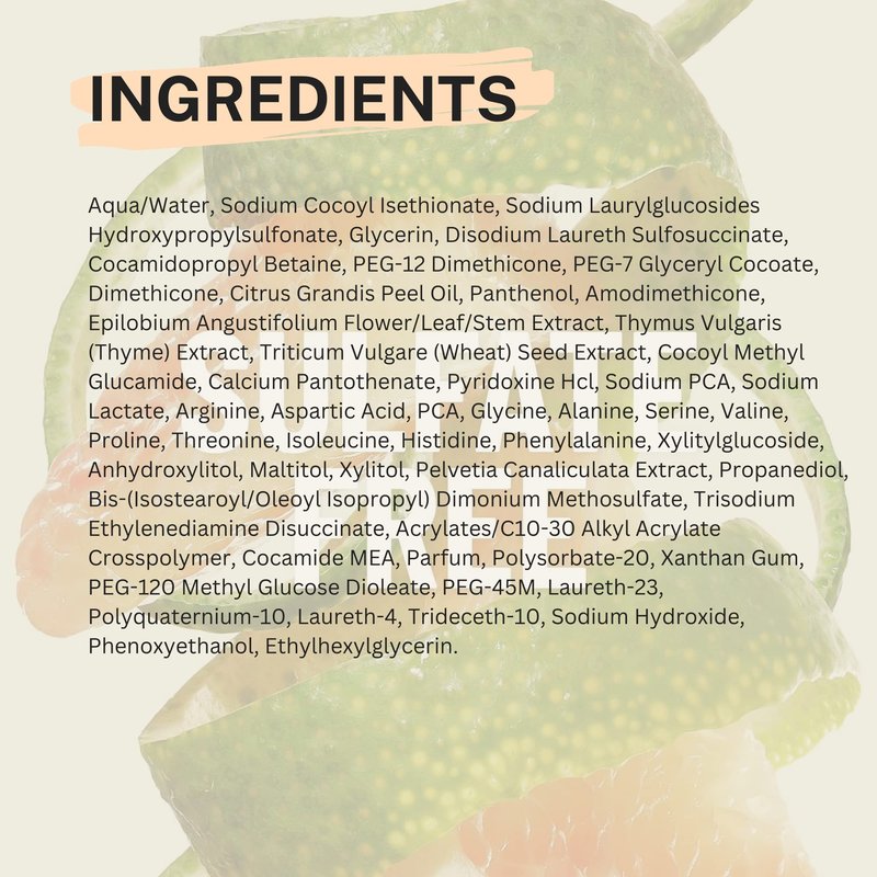 - Get ready for a juicy hair experience with our Pomelo Shampoo: Infused with the refreshing scent of pomelo, this shampoo will leave your hair smelling amazing all day long.