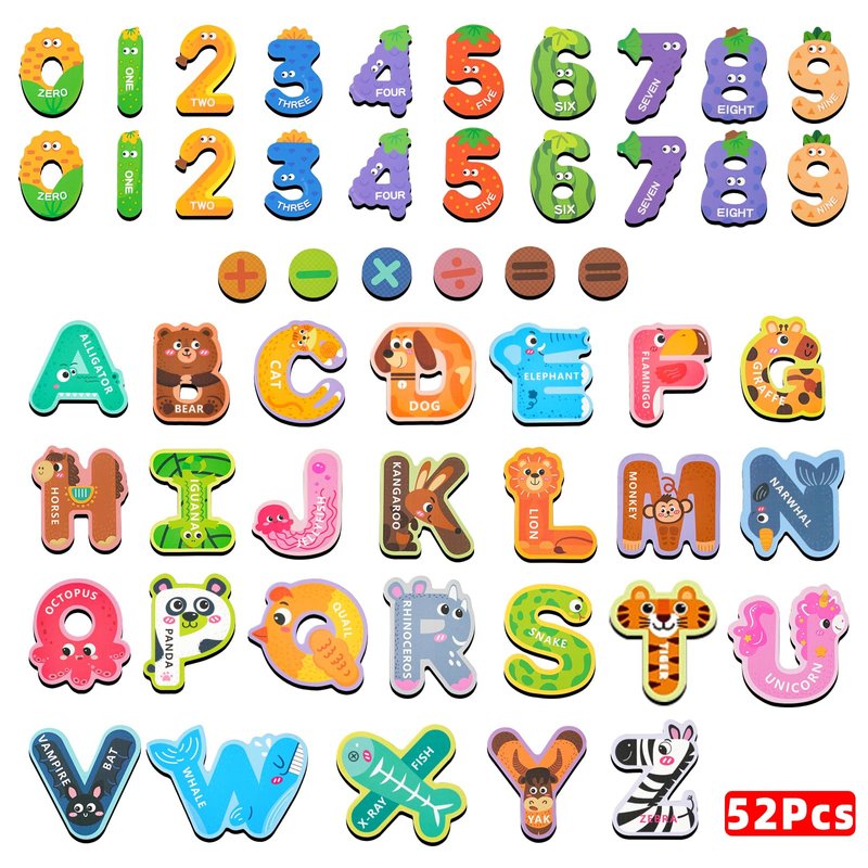 - 【GOOD LEARNING TOOL】Our preschool toys include 26 magnetic uppercase letters,20 numbers(0-9)and 6 math symbol(2 equal,1 plus,1 extact,1 divided,1 multiply),each letters with vivid animals on each representing the letter, like A for alligator