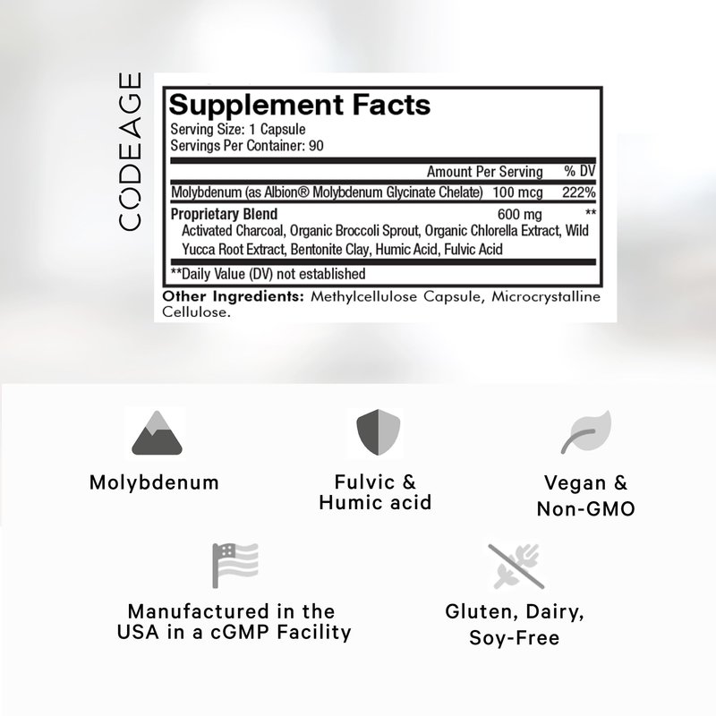 Codeage Binder + is a vegan biding supplement which offers activated charcoal, bentonite clay, humic acid, fulvic acid, and molybdenum in an all-in-one formula. Our systemic binder provides a source of specialized carbon and minerals. Codeage Bioactivated Binder + Broad Spectrum also contains organic broccoli sprout, organic chlorella extract, and wild yucca root extract. What’s Molybdenum? Molybdenum is an essential mineral that can be found in legumes, grains or specific types of meats. Our Molybdenum contains 100 mcg of molybdenum known as TRAACS bisglycinate per serving. Binder Supplement for Men and Women: ✓ 90 Servings per Bottle ✓ Veggie Capsules ✓ Non-GMO, Vegan, Dairy Free, Keto Friendly ✓ Free of carriers, fillers & artificial Ingredients ✓ Made In USA High-Quality: Codeage places the highest priority on product quality. Codeage Binder + contains high-quality ingredients and is manufactured in the USA in a cGMP facility. Unlike other binders in powder, gummies, dr formulated, chewable, tablets, liquid, pearls, our Bioactivated Binder + Broad Spectrum Supplement offers you a premium and smart supplement.*