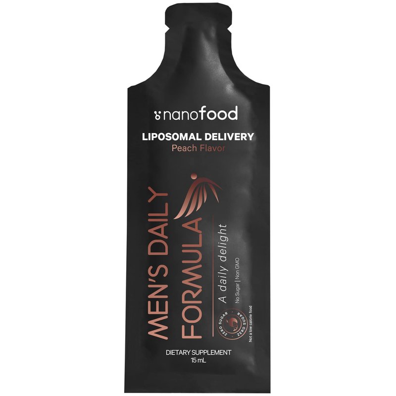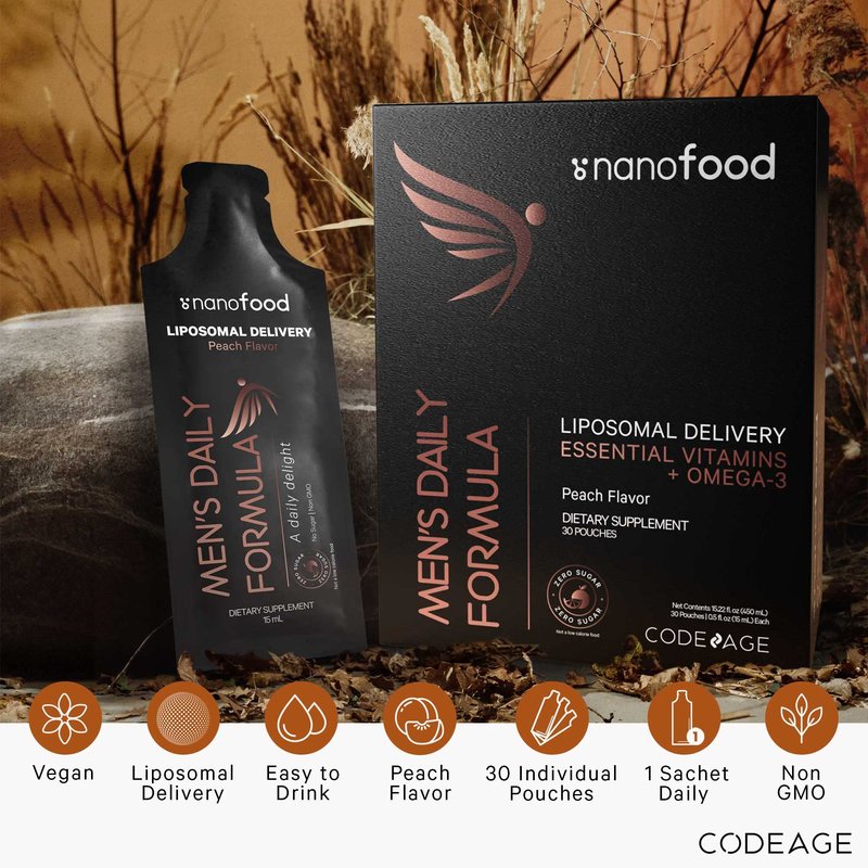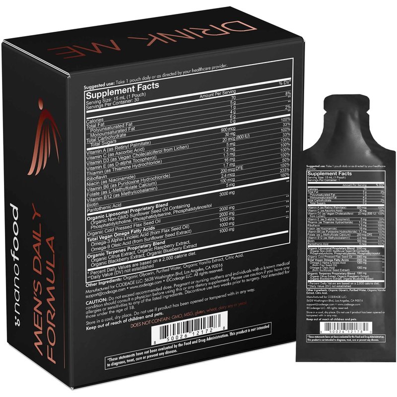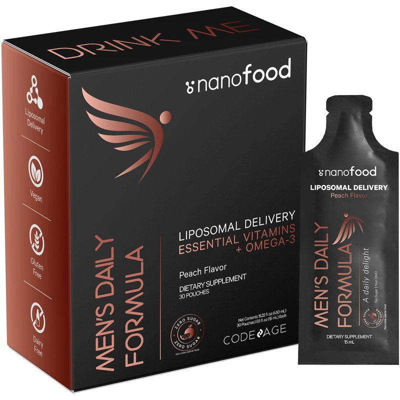 - Men's Daily Liquid Multivitamin Supplement Pouches: Codeage Nanofood Men's Daily vitamins formula features vitamin A, B, C, D, E, riboflavin, niacin, pantothenic acid in a liquid format with an exquisite peach flavor. Each pack of Nanofood vitamin liquid for men offers 30 pouches for 1 month of supply.