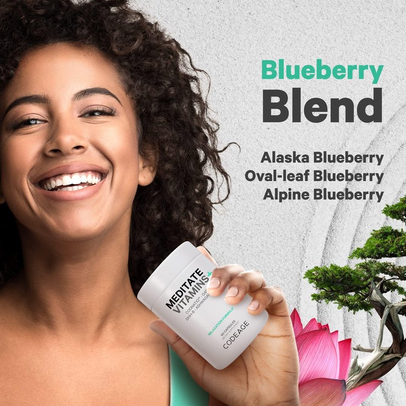 - Codeage vitamins for calming supplement also features a blend of different blueberries fruits, including Alaska blueberry, oval-leaf blueberry, and alpine blueberry. Codeage Meditate+ and stress vitamins formula also offers organic rhodiola rosea and dwarf bilberry fruit to help support relaxation.*