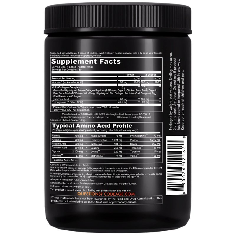 Codeage Multi Collagen Peptides Powder Black Edition offers 5 types of collagen all-in-one and features probiotics, vitamin C, and hyaluronic acid, in a hydrolyzed and unflavored collagen powder nutritional solution for women and men. This hydrolyzed collagen supplement is easy to mix with coffees, juices, and other beverages or recipes. Codeage Multi Collagen + Probiotics, Hyaluronic Acid and Vitamin C powder is non-GMO, gluten, soy, and dairy-free. This collagen formula for women and men has also zero carbs and offers amino acids. This unflavored collagen powder formula features 5 food sources of collagen peptides from hydrolyzed bovine collagen peptides, organic chicken bone broth, organic beef bone broth, hydrolyzed fish collagen peptides, and eggshell membrane collagen Part or all the ingredients provided in this collagen powder formula with probiotics, hyaluronic acid and vitamin C can be received in adequate or extra amounts from food and regular diet alone. Individual results may vary and depend on a lot of factors including age, health conditions, diet, genetic markup, lifestyle, physical activity, and regular exercise. Multi Collagen Complex 5 Types, Probiotics, Hyaluronic Acid, Vitamin C All-in-One: ✓ Grass-fed and pasture-raised hydrolyzed bovine collagen ✓ Wild-caught hydrolyzed marine collagen ✓ Organic bone broth ✓ Type 1, 2, 3 5 & 10 collagen ✓ Probiotics ✓ Hyaluronic acid ✓ Vitamin C ✓ Amino acids Collagen Peptides Powder Black Edition Supplement Combined With Probiotics & Vitamin C: ✓ 18 amino acids ✓ Unflavored ✓ Easy-to-mix ✓ Zero carbs ✓ Non-GMO ✓ Keto & Paleo friendly ✓ Soy, dairy & gluten-free ✓ Free of carriers & artificial ingredients ✓ Manufactured in the USA ✓ Third-party tested High-Quality: Codeage places the highest priority on product quality. Codeage Multi Collagen Peptides Black Edition & Hyaluronic Acid powder supplement is manufactured in the USA in a cGMP facility.