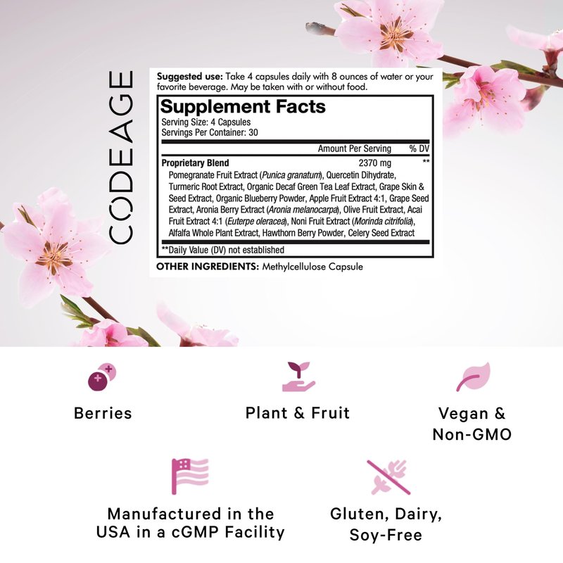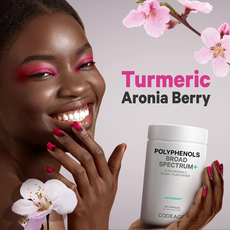 Codeage Polyphenols Broad Spectrum is a high quality blend of 15 different polyphenol-rich berries and botanical extracts. Polyphenols are micronutrients offering antioxidants that we can get through certain plant-based foods and are known to protect cells from free-radical damage.* Polyphenols are a type of micronutrient that contain health-promoting properties and can be found in a wide variety of fruits and vegetables. Plant polyphenols are rich in antioxidants, and are known to help fight off free radicals and prevent damage to cells. Perfect Formulation and Balance: Pomegranate Extract, Quercetin Dihydrate, Turmeric Extract, Bitter Orange, Organic Decaf Green Tea, Grape Extract, Blueberry Extract, Apple Extract, Aronia Extract, Olive Extract, Açaí, Noni, Alfalfa, Hawthorn Berry Powder, Celery Extract. A Smart Bioavailability supplement for men and women: ✓ 120 Capsules per bottle ✓ Vegetarian capsules ✓ 15 different polyphenols ✓ 100% Natural, Non-GMO, Organic, Vegetarian, Dairy Free, Keto Friendly ✓ Made In USA and Free of carriers, fillers & artificial Ingredients ✓ Unique formula Free from magnesium stearate, gluten, artificial sweeteners and colors, GMOs and other unnecessary excipients. High Quality: Our supplements are made in the USA in a GMP facility. Every single ingredient has been tested for purity and quality. Unlike other polyphenol in powder, gummies, dr formulated, chewable, tablets, liquid, our Women's Polyphenols Broad Spectrum Supplement offers you a premium and smart supplement.*