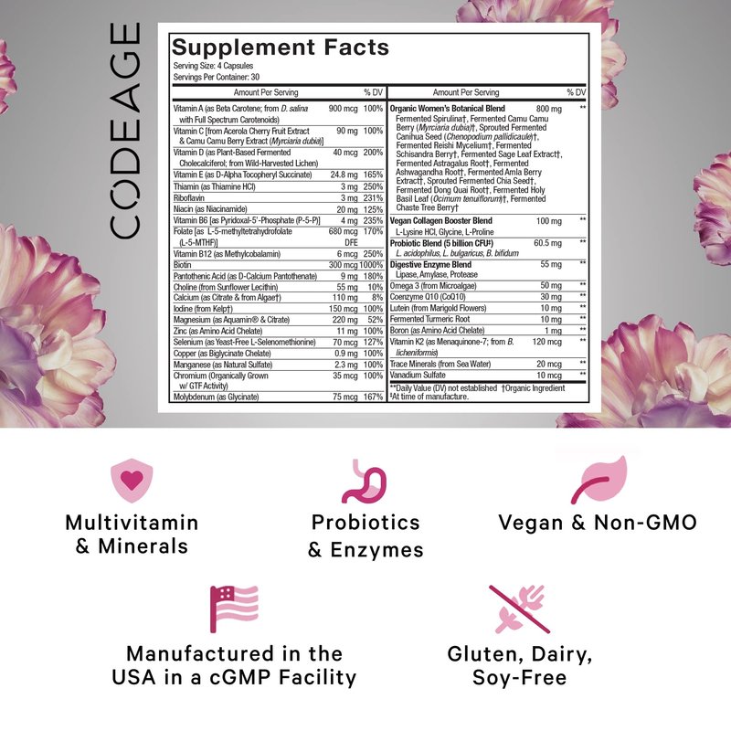 - 25+ daily vitamins & minerals: Codeage Women daily multivitamins is designed specifically for women. This premium formula offers 25+ daily vitamins and minerals in an all-in-one solution. Our women multi is made with real whole foods and offers probiotics, fermented vitamins, enzyme-activated minerals, fruits, vegetables and more.