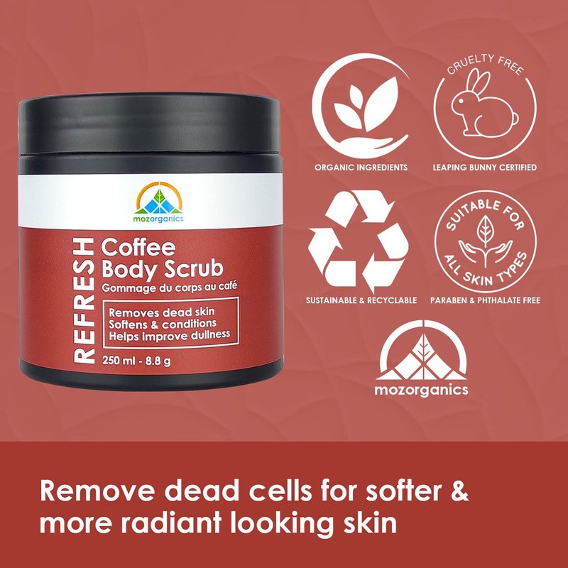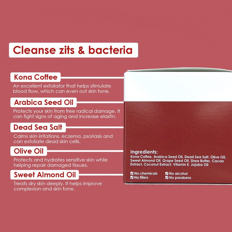 - Exfoliates Dead Skin: Dead sea salt and kona coffee are antioxidants that work together to improve the appearance of skin. These cleansing and moisturizing effects help soothe and emphasize healthier skin.
