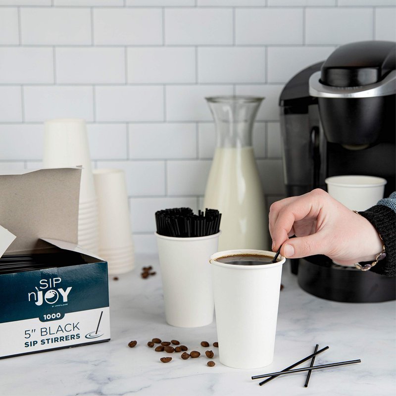 Black Sip Stirrers by Crystalware Each box contains 1,000 stirrers. The straws are hollow and can be sipped with like a regular straw. Our sip stirrers can be used for hot or cold drinks. Great for catering events, coffee shops, convenience stores, home parties, gas stations, restaurants, bars, office and personal home use. Can be used in most regular sized cups. These are also great for schools, day care centers, and nursing facilities. These stirrers by Crystalware are a great addition to any drink, fun for kids and adults too! Product Features: STIRRER IN A LARGE BULK BOX: These Black stirrers come packed by 1000 pieces, sure to last for a long time GREAT FOR HOT AND COLD BEVERAGES: Great for mixing drinks such as coffee, tea, mixed drinks, cocktails, hot chocolate, etc. Can be used as stirrer as well as a straw and hot and cold drinks FOR HOME OR BUSINESS: Perfect for restaurants, bar supply, coffee shop, institution, concession stand, school, office break-room and for your daily home use PERFECT TO SERVE WITH COCKTAILS: Works well for all you mixed drinks, these narrow, short straws are the perfect size for sipping from an old-fashioned glasses or short tumbler FOOD SAFE & BPA-FREE: Made with high quality polypropylene, these thin straws can be used safely for all your hot and cold beverages.