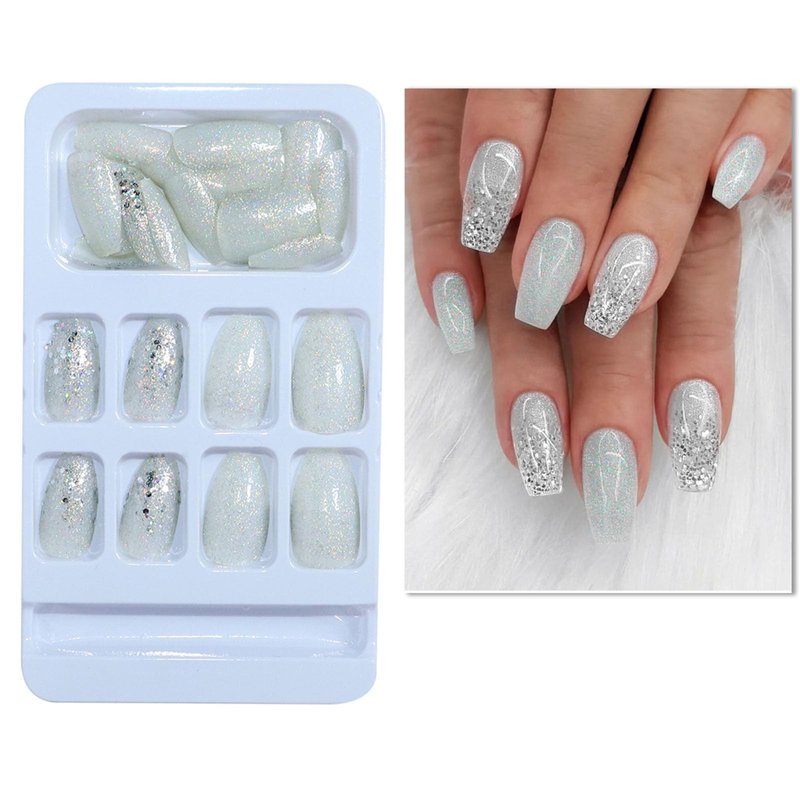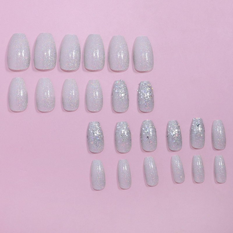 Coffin Press on Nails Short Acrylic Nails Silver Glitter Sequins Fake Nails Designs Artificial Glue on Nails Glossy Short Ballerina Stick on Nails for Women 24 Pcs / 12 Size
