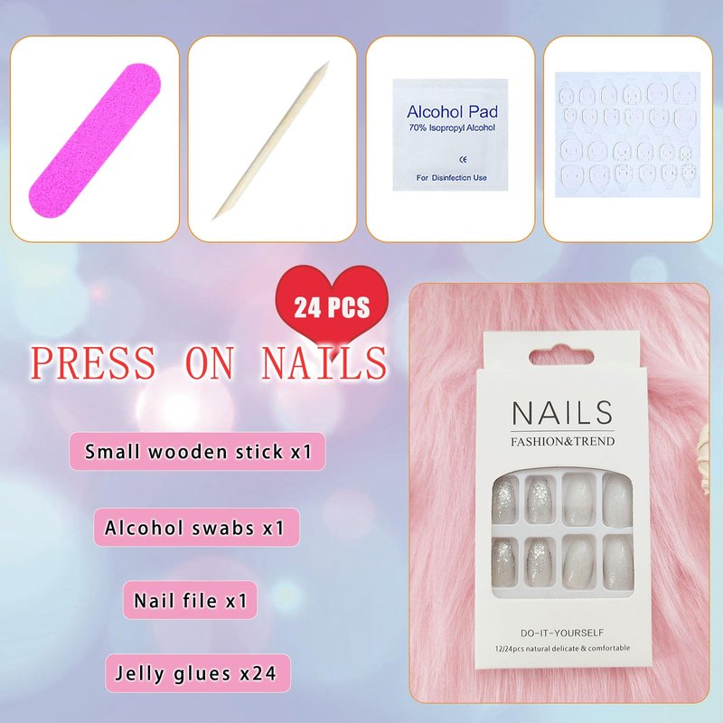 - 💗You Will Get: The package contains 24 pieces of press on nails of different sizes, 1 mini manicure file, 1 small wooden stick, and 1 piece of nail glue sticker. (Jelly glue can last about 3 days or more, glue remains longer)
