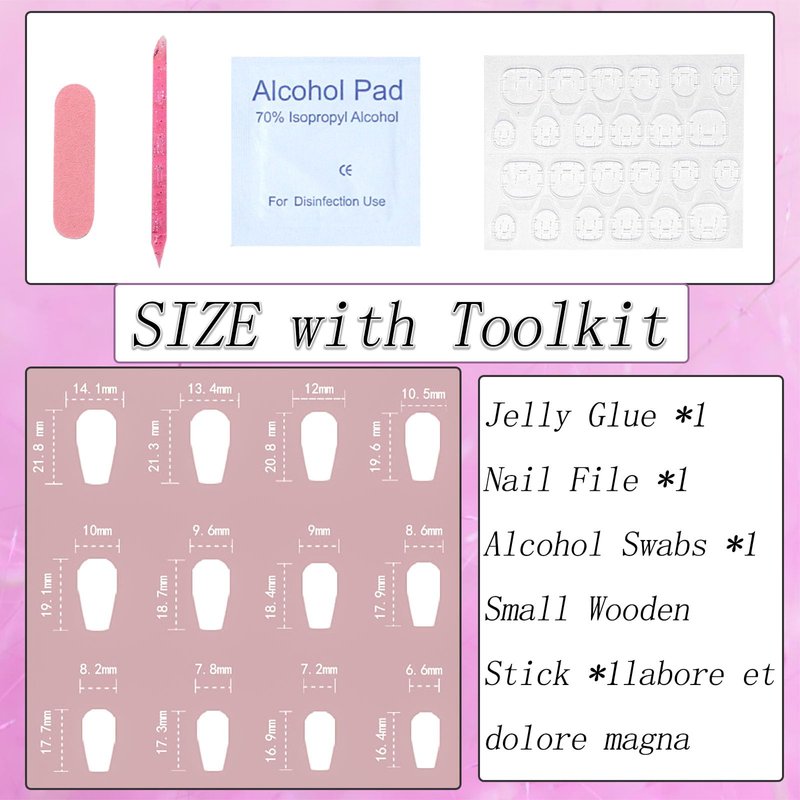 - Package List: 24 pcs short press on nails kit, each box includes 24 fake nails, 1 sheet of 24 adhesive nail tabs, 1 cuticle stick, 1 double sided nail file and gel nail cleaning pads.