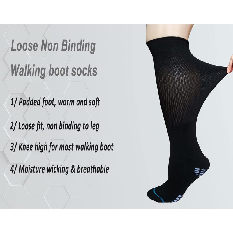 Warm And Soft Medical Cast Socks: Circulation problem or have cast on foot will always cause feel cold at feet. These non binding edema socks non constrict to leg circulation and the cushioned foot will keep feet warm in cold winter. The knee high walking boot socks could cover your calf, avoid irritation caused by air cast cam walker boot. The thickly soft cushioned foot make your feet dry and comfortable.