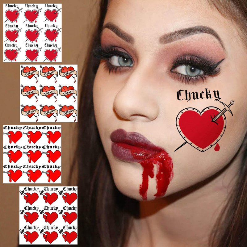COKTAK 36 PCS Bride of Chucky Tattoo Heart For Women Men Kids Adults, Halloween Zombie Chucky Makeup Kit, Chucky Heart Temporary Tattoos Stickers Cosplay, Bride of Chucky Rave Party Accessories