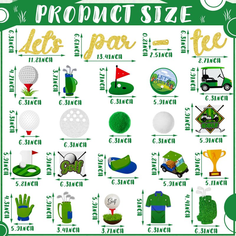 Features: Quality is a cornerstone of our golf party decorations supplies. From the material applied to the design elements, the things intend to deliver the delicate feeling to our customers. With our banners, not only do you experience excellent quality but also prolonged usability. These golf party decors can double up as wonderful gifts or party souvenirs, making for a lasting memento for your guests. This can be the ideal touch to make your party memorable and leave a heartwarming impression among your attendees. Specifications: Banner material: felt, paperMain color: white, greenSize: about 9.84 ftPackage includes: 5 x Golf themed bannersNotes: Manual measurement, please allow slight errors on size. The color may exist a slight difference due to different screen displays.