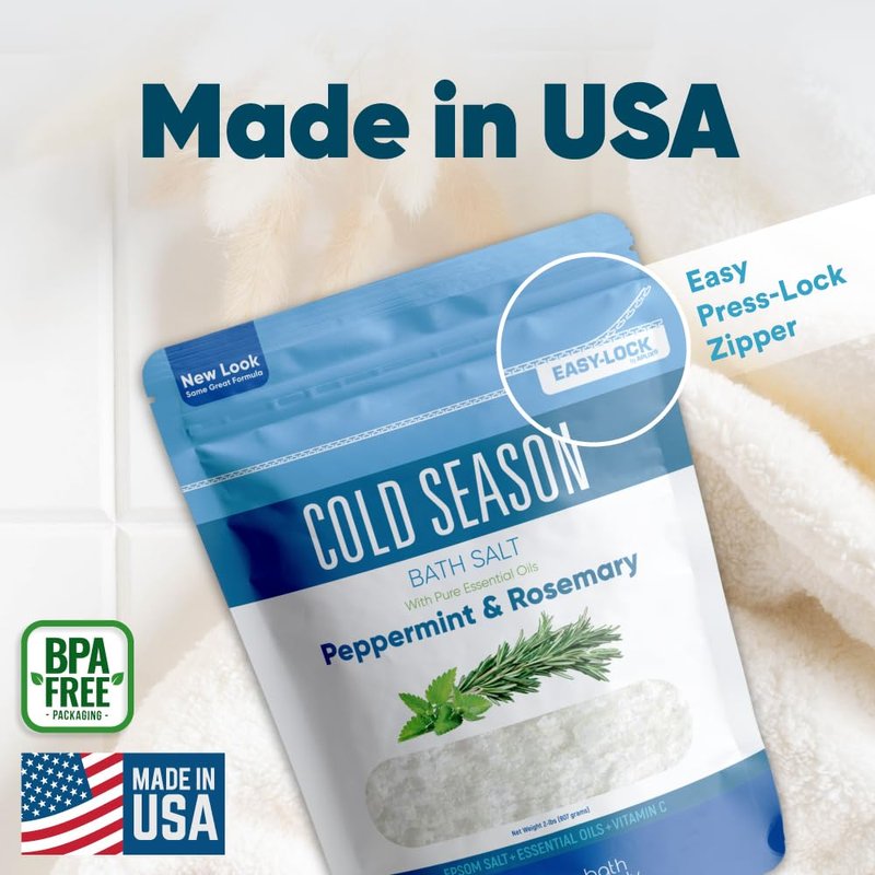 Cold Season Bath Salt 32 Ounces Epsom Salt with Natural Rosemary, Peppermint, Eucalyptus and Lemon Essential Oils Plus Vitamin C in BPA Free Pouch with Easy Press-Lock Seal