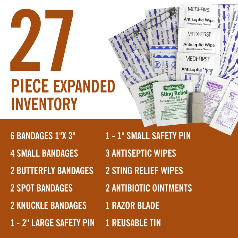 - One Coleman 27 piece all purpose Mini First Aid Kit - for car, home and emergency prepardness
