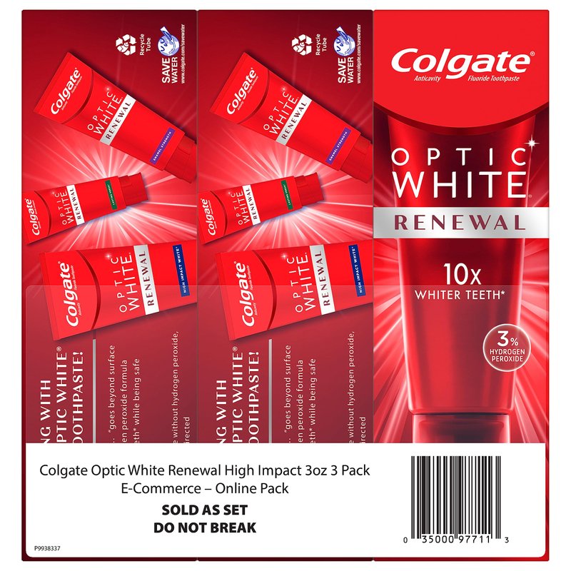 - Three 3 oz. tubes of Colgate Optic White Renewal Whitening Toothpaste, High Impact White