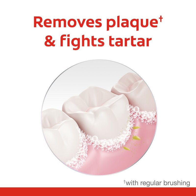 - Fights tartar and removes plaque (with regular brushing)
