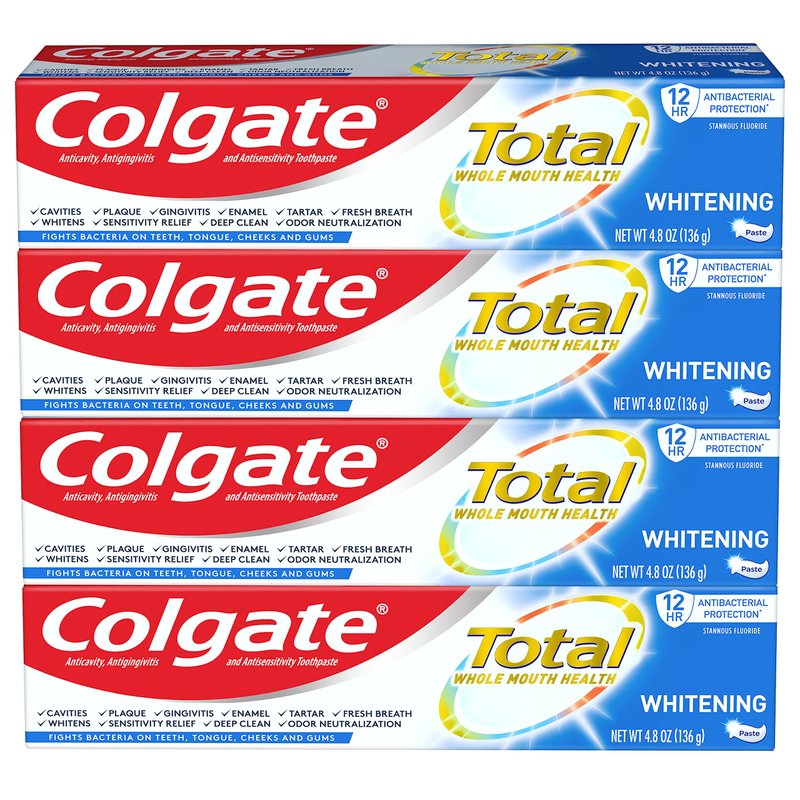 - Four 4.8 oz tubes of Colgate Total Teeth Whitening Toothpaste