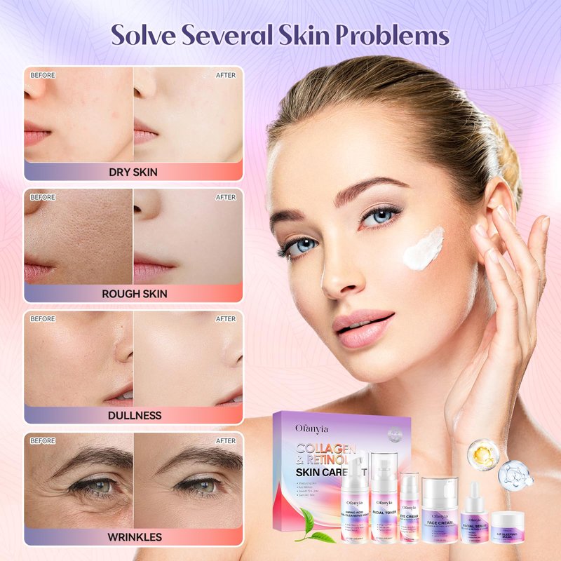 - 【Collagen & Retinol Skincare Set】Ofanyia skincare set is enriched with powerful ingredients, retinol, collagen and vitamin c, which help soothe the skin, enhance its elasticity, and keep it plump to make lines and wrinkles less noticeable and anti aging, promoting a youthful and radiant complexion.