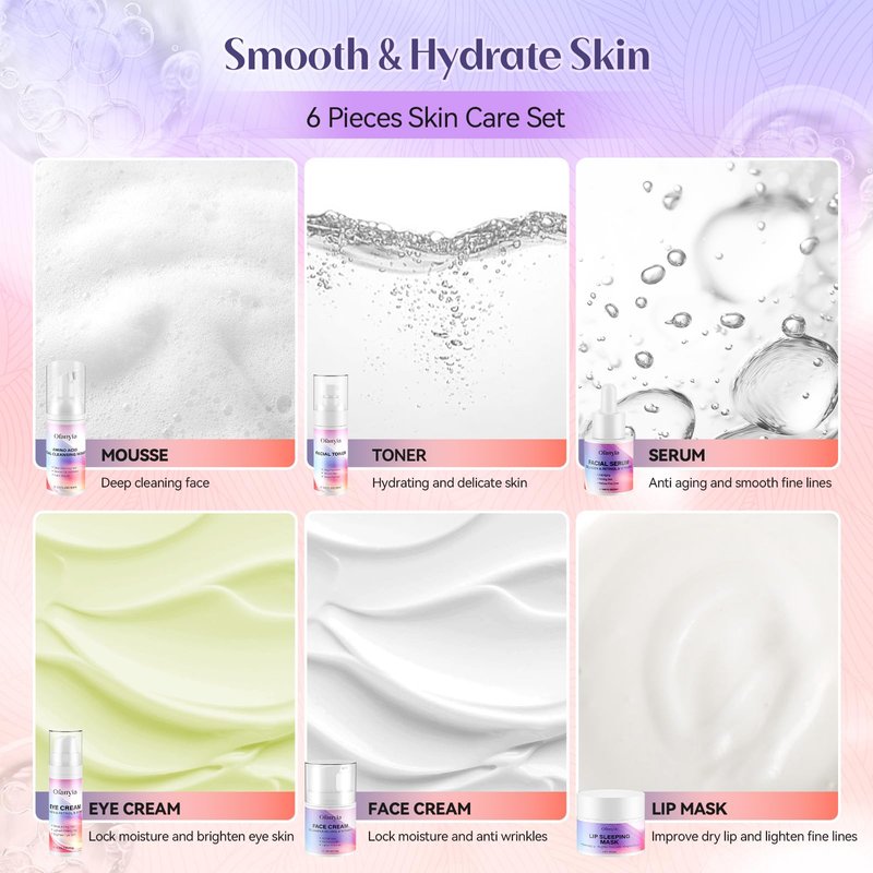 - 【Skincare Gift Set】This 6-piece traval skincare set routine contains our AMINO ACID Facial Cleansing Mousse, Facial Toner, Collagen & Retinol Face Serum, Collagen & Retinol Eye Cream, Collagen & Retinol Face Cream and Lip Sleeping Mask. Our skin care sets for women contains a variety of plant essences, which can effectively repair damaged skin, solve wrinkles and fine lines, shrink pores, and make skin moisturizing.