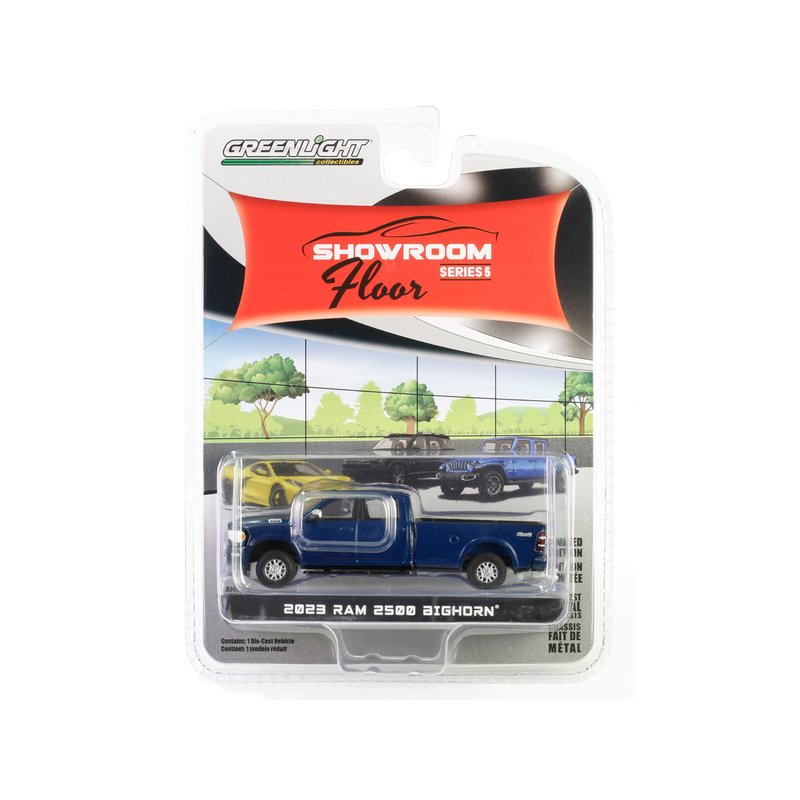 Brand new 1/64 scale diecast car model of 2023 2500 Bighorn Crew Cab 4x4 Pickup Truck Patriot Blue Metallic "Showroom Floor" Series 5 die cast model car by Greenlight 68050A