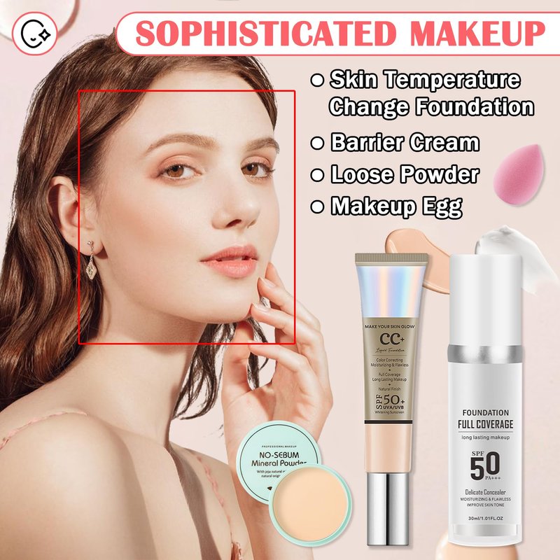 🎯Full coverage foundation set, colour changing concealer foundation, lightweight and delicate moisturising face primer, long-lasting setting loose powder, is the perfect everyday face foundation make-up set.