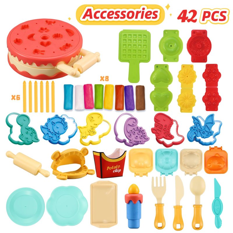 - 42 KITCHEN ACCESSORIES: Rich kitchen accessories set, in addition to a multifunctional cake, but kids can make six kinds of cute dinosaur cookies, waffles, fries, doughnuts, dumplings, knife and fork plate, etc