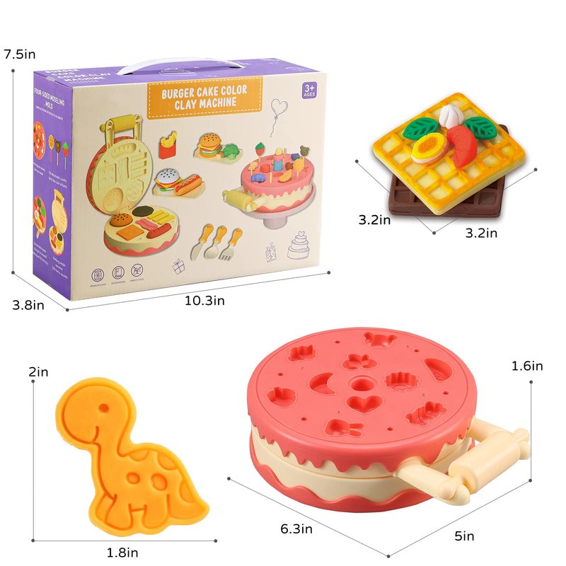 - UNIQUE CAKE TOOLS: There are 24 shapes on the surface of the cake including delicious food, cute animals, vegetables and fruits, and the sun and the moon. When toddlers unfold the cake, they will get a burger machine for making burgers