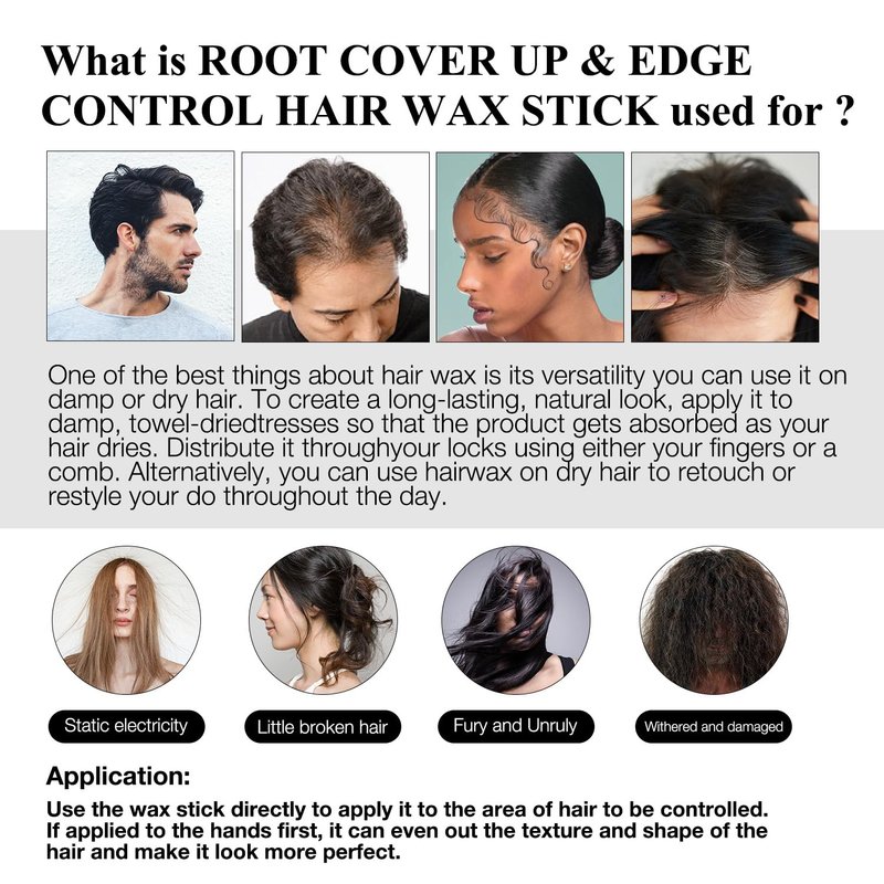 - What is ROOT COVER UP & EDGE CONTROL HAIR WAX STICK used for? One of the best things about hair wax is its versatility you can use it on damp or dry hair. To create a long-lasting, natural look, apply it to damp, towel-driedtresses so that the product gets absorbed as your hair dries. Distribute it throughyour locks using either your fingers or a comb. Alternatively, you can use hairwax on dry hair to retouch or restyle your do throughout the day.