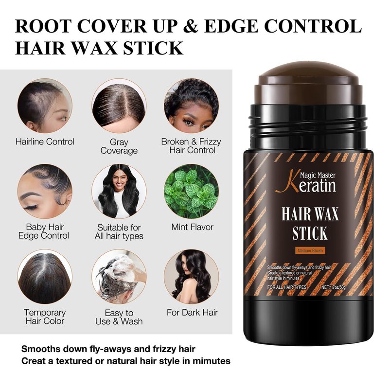 What is ROOT COVER UP & EDGE CONTROL HAIR WAX STICK used for? One of the best things about hair wax is its versatility you can use it on damp or dry hair. To create a long-lasting, natural look, apply it to damp, towel-driedtresses so that the product gets absorbed as your hair dries. Distribute it throughyour locks using either your fingers or a comb. Alternatively, you can use hairwax on dry hair to retouch or restyle your do throughout the day.