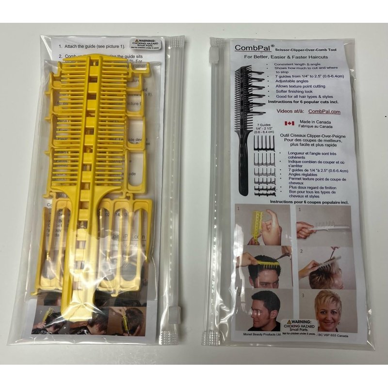 CombPal haircutting tool with 1 double-sided comb works as a 1/4" (0.6cm) guide. 7 guides: 1/2", 3/4", 1', 1-1/4", 1-1/2", 2", 2-1/2" (1.3cm, 1.9cm, 2.5cm, 3.2cm, 3.8cm, 5cm, 6.4cm). Attach the guide to the comb, push it down to lock. CombPal is available in black, gray or yellow.