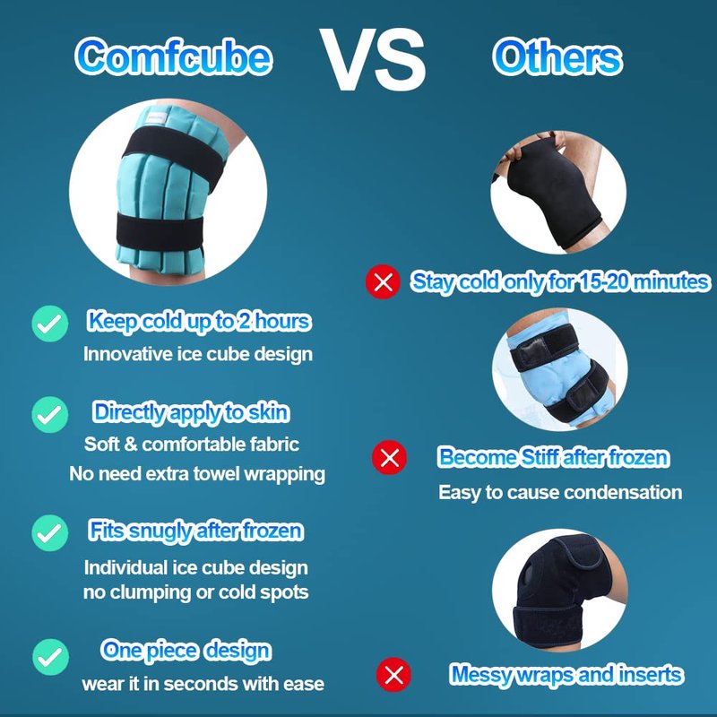 - Ultra Long Lasting Coldness - Comfcube knee ice pack uses patent ice boxes design to stay cold up to hours, and release coldness continuously to provide quicker and deeper relief, no need to return to the freezer repeatedly. Unlike other cold packs, Comfcube knee ice pack allows for evenly dispersed cooling, no more cold spots or clumping.