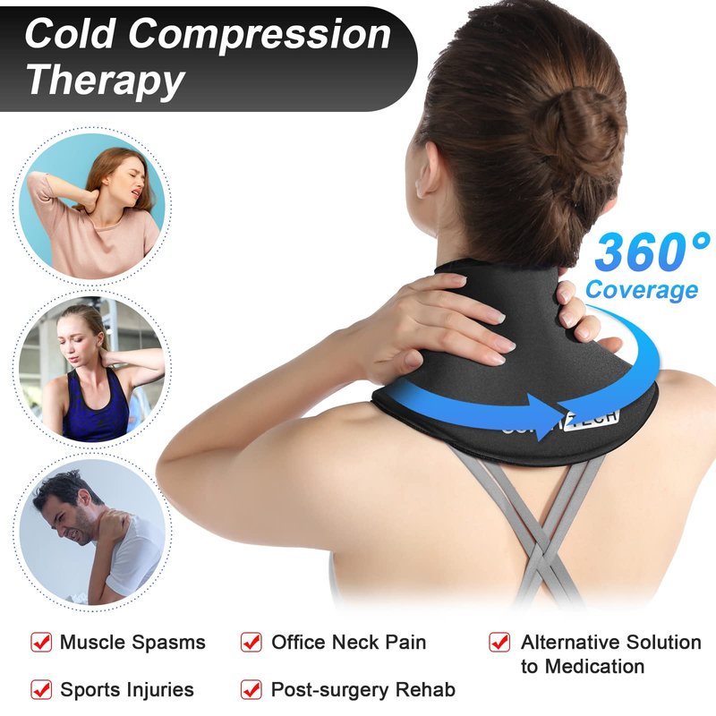 - Snug Fit for Better Cold Compression - ComfiTECH ice pack for neck with stretchable lycra fabric and filled with expert-grade gel ensure a comfortable and soft experience. The neck ice pack wrap gel still remains flexible even after frozen. Extra elastic strap helps to keep neck cold pack wrap in place to free up your hands.