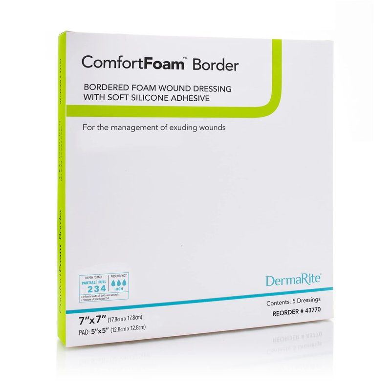 ComfortFoam Border Foam Wound Dressing, 7”x 7”, 5 Pack, Soft Silicone Adhesive, Highly Absorbent, Latex Free, Self-Adherent, Showerproof, Flexible, Cut to Fit