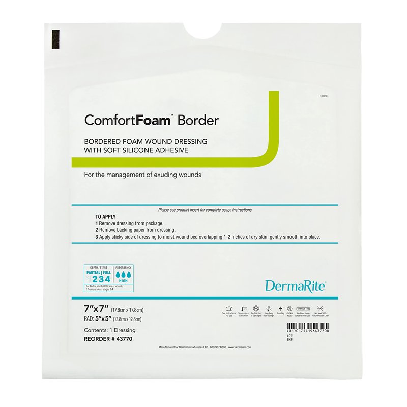 - 5-LAYER DRESSING: ComfortFoam Border’s five-layer construction helps protect the wound bed, draw moisture away from the wound, and shield the wound area from outside contamination.