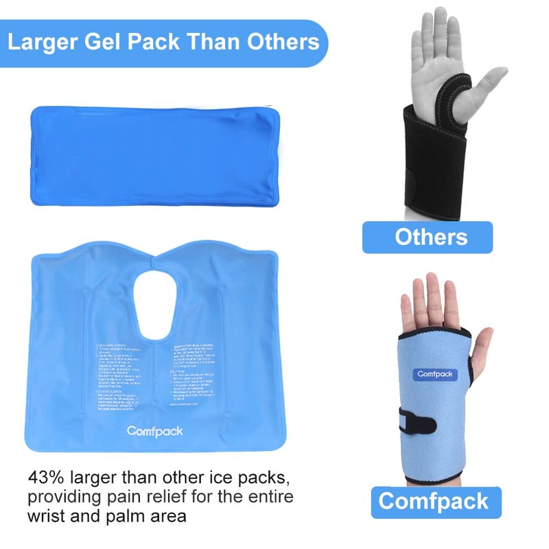 - Larger Gel Pack Covers More Area - Comfpack hand ice pack for arthritis measures 9.8 x 8.5inch, which is larger than the ordinary wrist ice pack wrap. Comfpack ice pack for wrist can not only cover the entire wrist, but also provide relief for your hand and palm area. If you want to ice your thumb, you can keep it inside. There are also other different wearing methods to sooth pain on targeted areas of your hand.