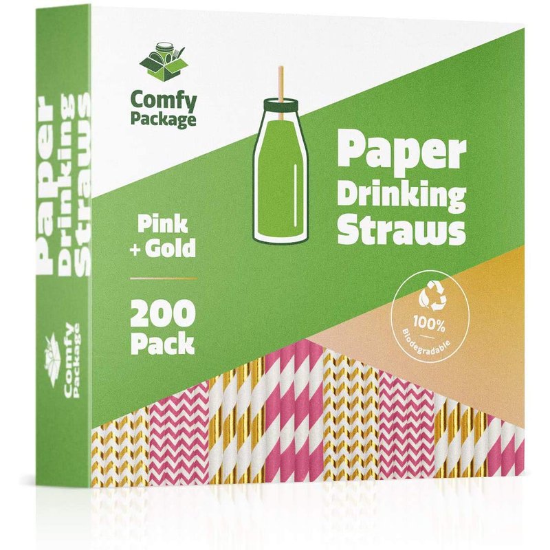 Comfy Package, [200 Pack] Hot Pink & Gold Paper Drinking Straws 100% Biodegradable Multi-Pattern Party Straws