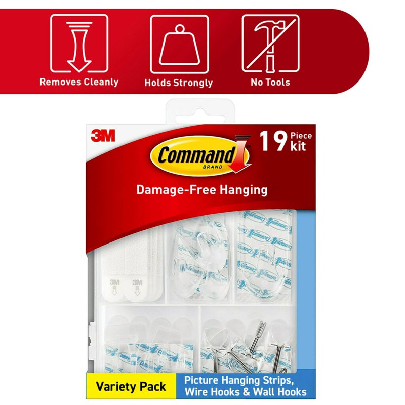 - HANGS UP TO 19 ITEMS: One Clear Command Variety Pack includes four small and four large picture hanging strips, three medium wall hooks, one large wall hook, seven mini adhesive hooks, four wire hooks and 22 Command Strips