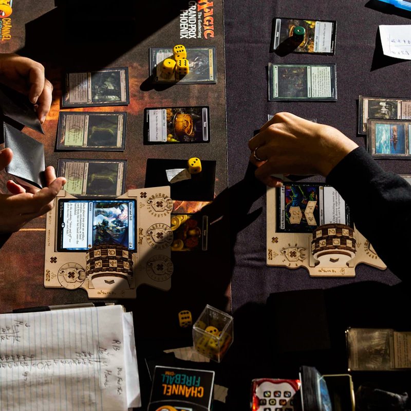 A Cool Command Zone Tray with integrated life counter, commander cast tracker, and commander damage trackers on up to three opponents. As practical as it is handsome, level up your game enjoyment with the ultimate EDH accessory.