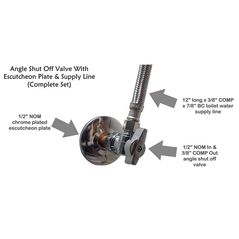 This set includes a heavy duty, single piece body 1/4 turn angle stop valve providing a solution to long lasting, dependable shut-off valve you need to put in for your residence, commercial properties, and all places that require an angle shut-off valve with 1/2 in. NOM. inlet x 3/8 in. COMP outlet. The set also includes a chrome plated beveled 1/2 in. NOM escutcheon plate and 12" stainless steel braided toilet water supply, with zinc-plated brass nut for heavy duty usage, to hook up your toilet. The valve is chrome plated, lead free, solid single piece design made for long-lasting durability and heavy duty usage. Every valve is leak-free quality controlled by the factory during the manufacturing process. The set is made for homeowners, DIYers, plumbers, and contractors to be used in potable and non-potable plumbing and water distribution systems.