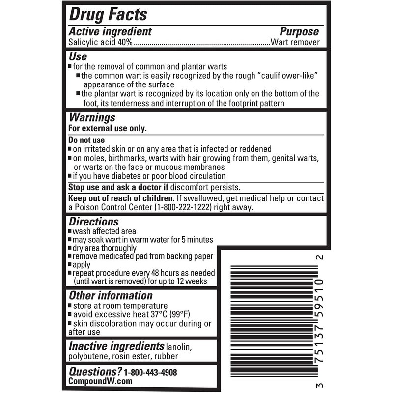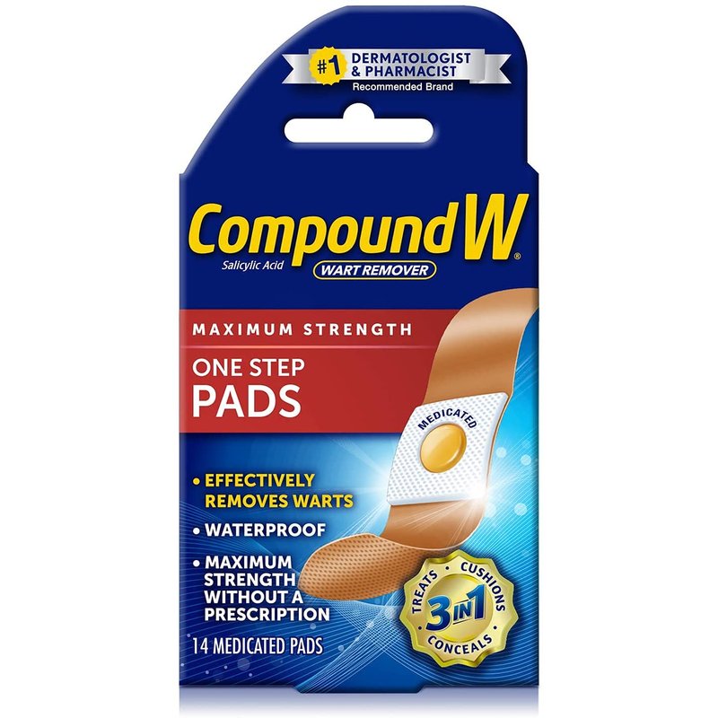 Compound W Maximum Strength One Step Wart Remover Pads | 14 Count | Pack of 3. Easy-to-use maximum strength medicated bandage designed to conceal, protect, and remove stubborn common warts. NDC Code(s): 63029-594-14