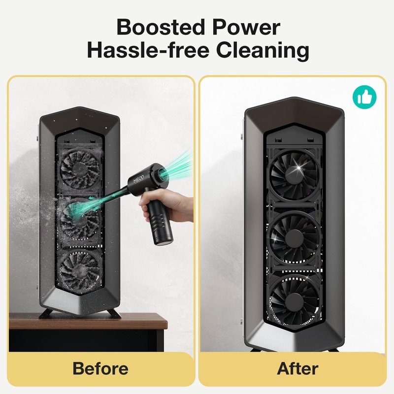 - [Effortless Control & Button Upgrade]: MECO dust blower is designed with separate switches and speed control buttons. You can easily turn on or change gear.★★Perfect Gift - Due to the wide range of applications, compressed air duster would be the perfect gift for people with cleaning needs, such as housewives, cleaners, maintenance workers, office workers, barbers, etc.