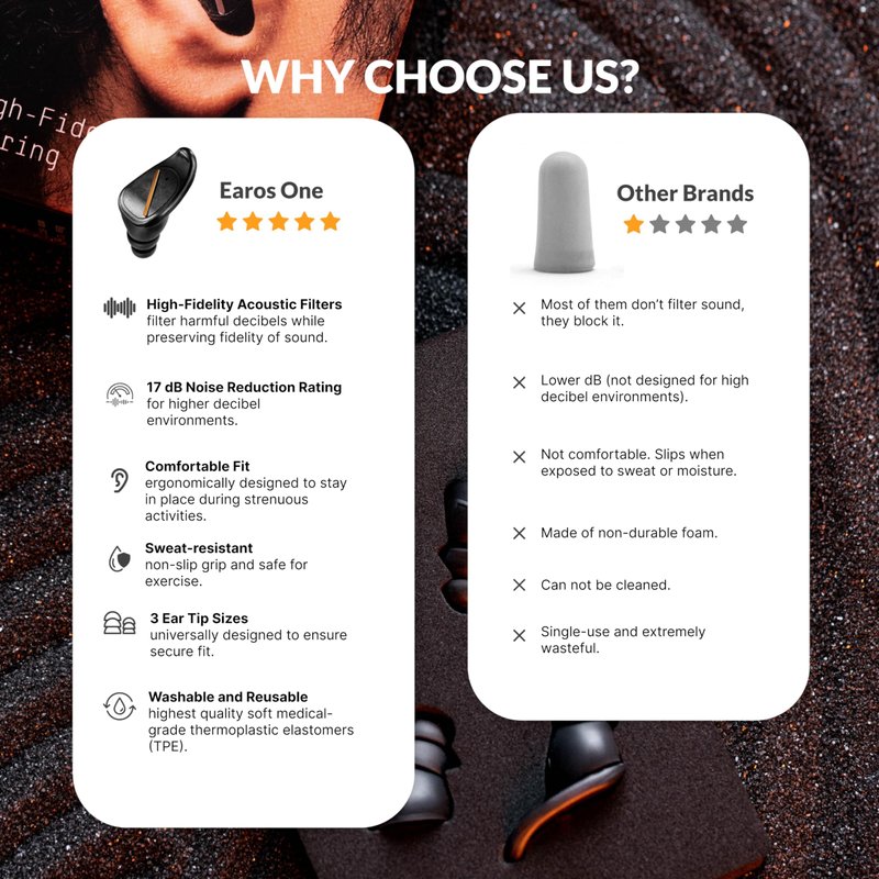 - Expertly Engineered Acoustic Earplugs - Developed with the former Director of MIT's Acoustics & Vibratory Lab, EAROS reproduces the sound curve of your natural ear while delivering a unique combination of sound clarity and hearing protection.
