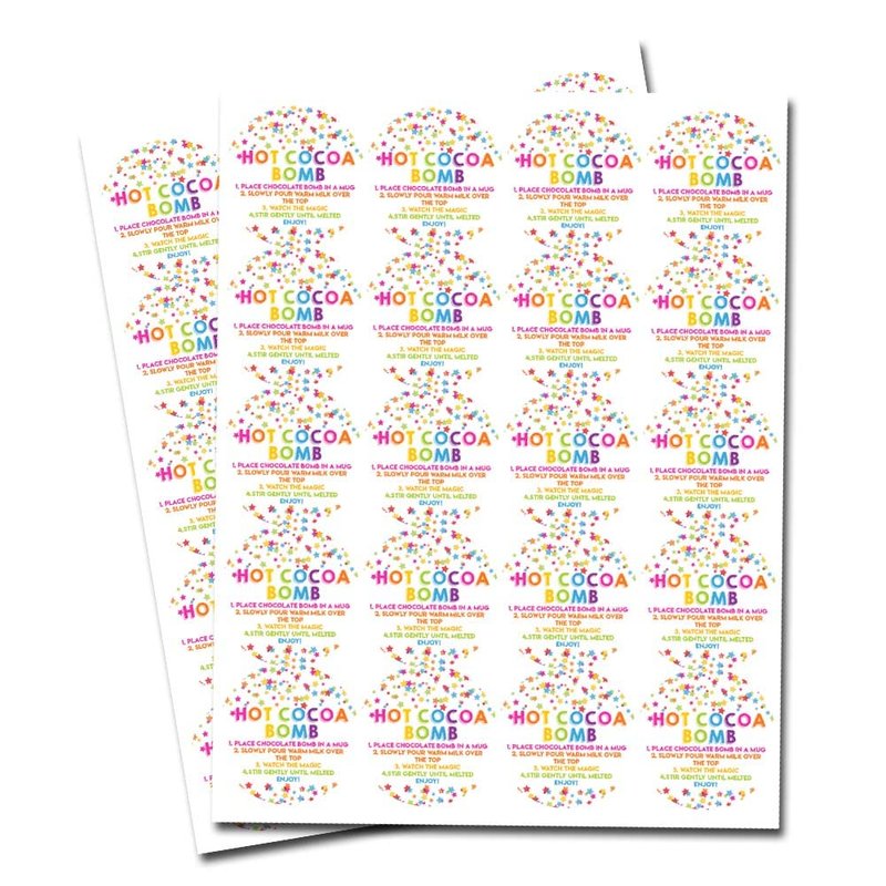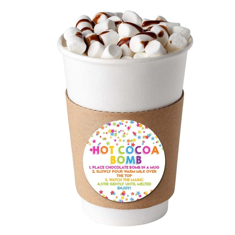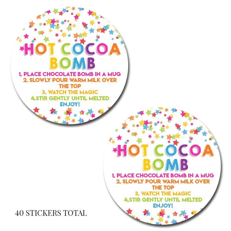 - Cocoa Bomb Overload: Hot cocoa bombs are all the rage this year! Giving some out as gifts and want your packaging to stand out? Designed by a talented mom, these fun stickers feature a cute confetti rainbow stars design, plus all the detailed cocoa bomb instructions to fit perfectly on a package. These are great for making your hot chocolate bomb gift packs extra special for your friends & loved ones! Amanda Creation. Original design by Amanda Creation.