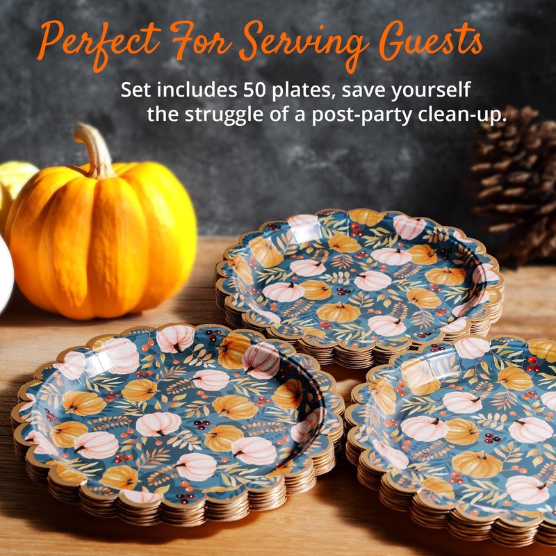 - Serves 50 Guests: Set includes 50x 9-inch beautiful fall-themed party paper plates perfect for serving guests at your upcoming Thanksgiving dinner.