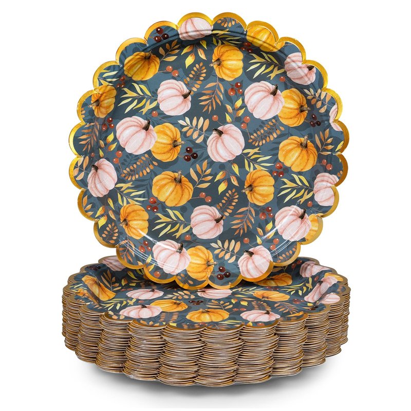 Confettiville Thanksgiving Paper Plates, 50-Count Disposable Thanksgiving Dinner Plates, Scalloped, Party Supplies, Pumpkins, Slate Grey