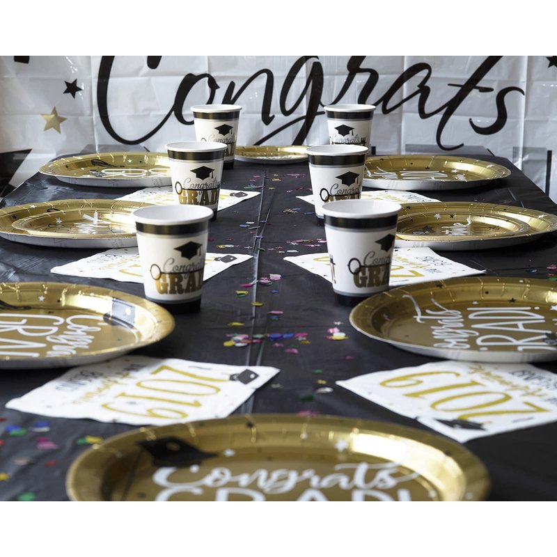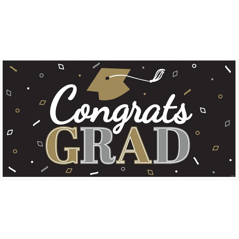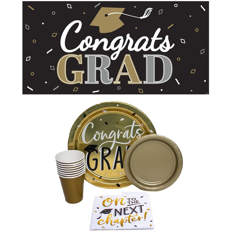 - Roll out our massive 65” Congrats Grad! banner and celebrate the graduation of that special someone with this gold and black themed party tableware set against a backdrop of graphics featuring stars and graduation caps.