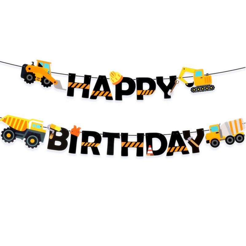- The construction birthday banner is a great addition to decorate your child's birthday party. Also dump trucks, bulldozers, Excavator, Tank Truck, Orange Road Cones, and Safety hat are included as pictured.