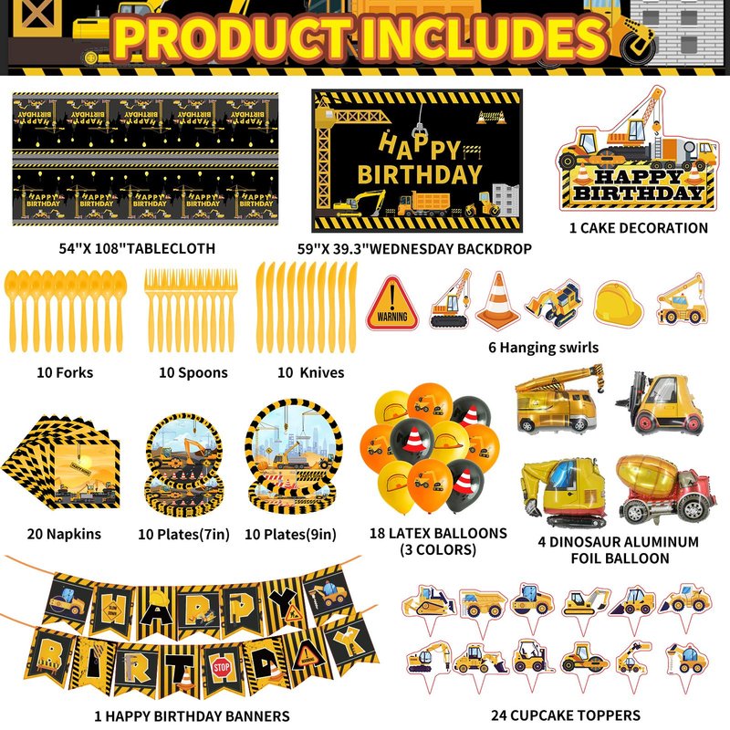- 【Construction BIRTHDAY PARTY PACKAGE】Construction birthday party supplies includes 1 happy birthday banner, 1 backdrop, 1 tablecloth, 6 hanging swirls, 1 cake topper, 24 cupcake toppers, 18 latex balloons, 4*giant truck foil balloons (dump truck, loader, crane, concrete mixer), 20 plates, 10 knives, 10 forks, 10 spoons, 20 napkins, 1*dot glue, 1*balloon chain. Meet all your needs for the party.