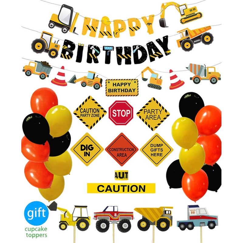 - DESIGN: The highly detailed design of our construction party happy birthday banner, vehicle banner, traffic signs cutouts, balloons and cake toppers will make your child feel the atmosphere of a busy construction zone right inside the party. Our construction party supplies are guaranteed to create unforgettable memories for your child, family and guests