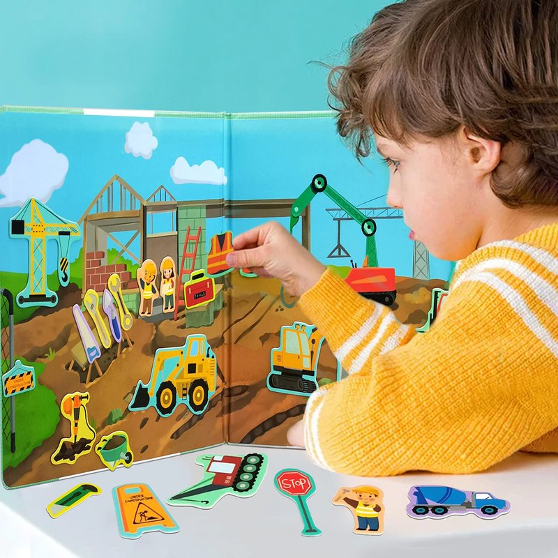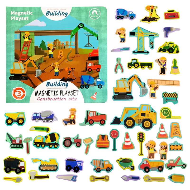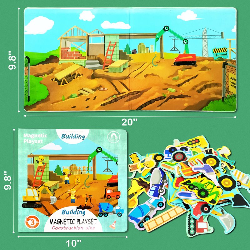 Include 50 construction site themed magnets, a magnetic play book with illustrated scenery backdrop.